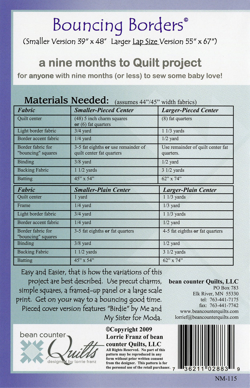Pieced or plain center From the Nine Months to Quilt Series for any one with nine months (or less) to sew some baby love!Small 39in x 48inLap 55in x 67in