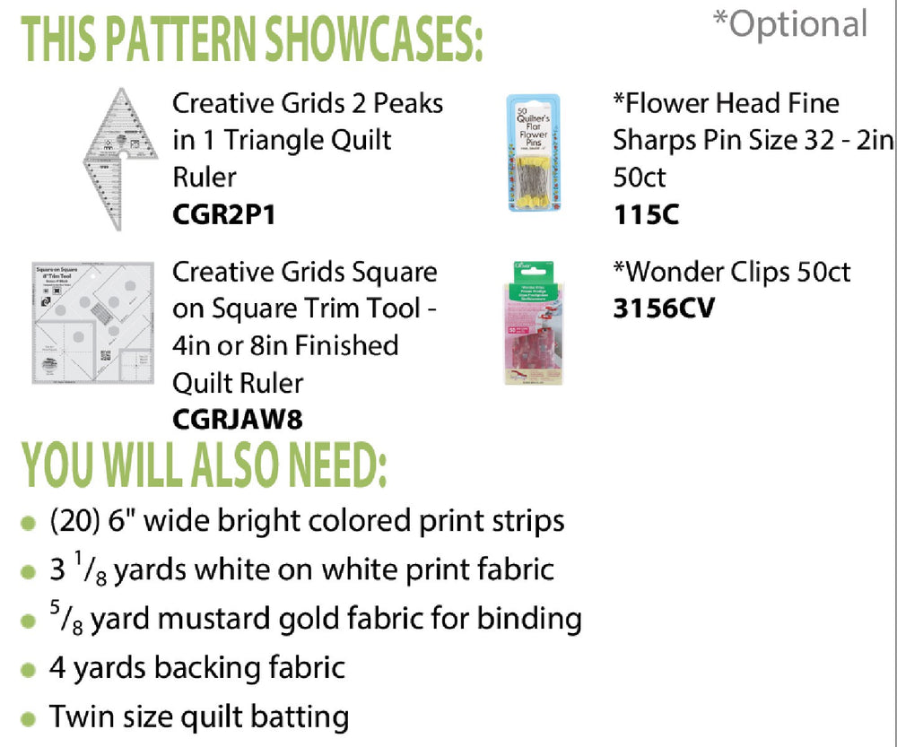 Snails Trail Al Fresco combines Snails Trail blocks with diamond shapes to create this colorful version of a traditional Storm at Sea quilt. The Creative Grids Square on Square Trim Tool includes markings to create the perfect-sized center four-patch. After that, creating the Snail’s Trail block is just a matter of color placement!
