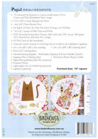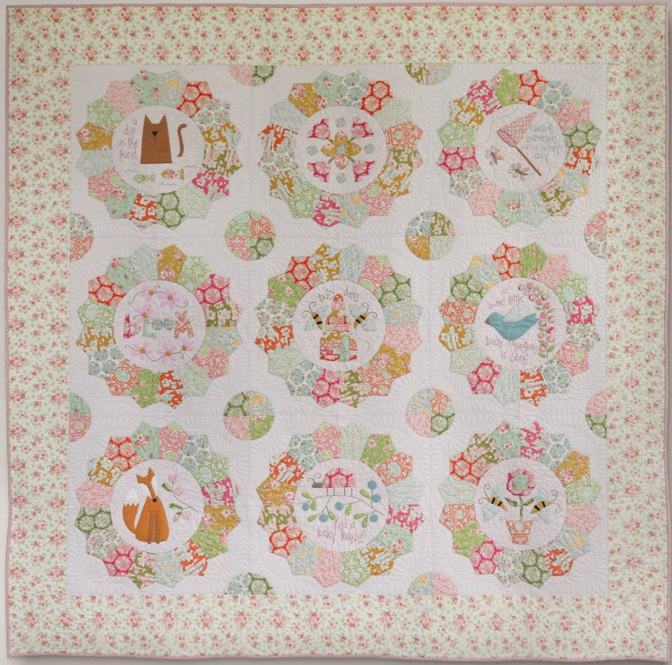 A nine-month BOM pattern set. Applique, stitchery and English paper-piecing techniques, featuring sweet critter and floral designs set in Dresden plates. Finished Size is 74" square.