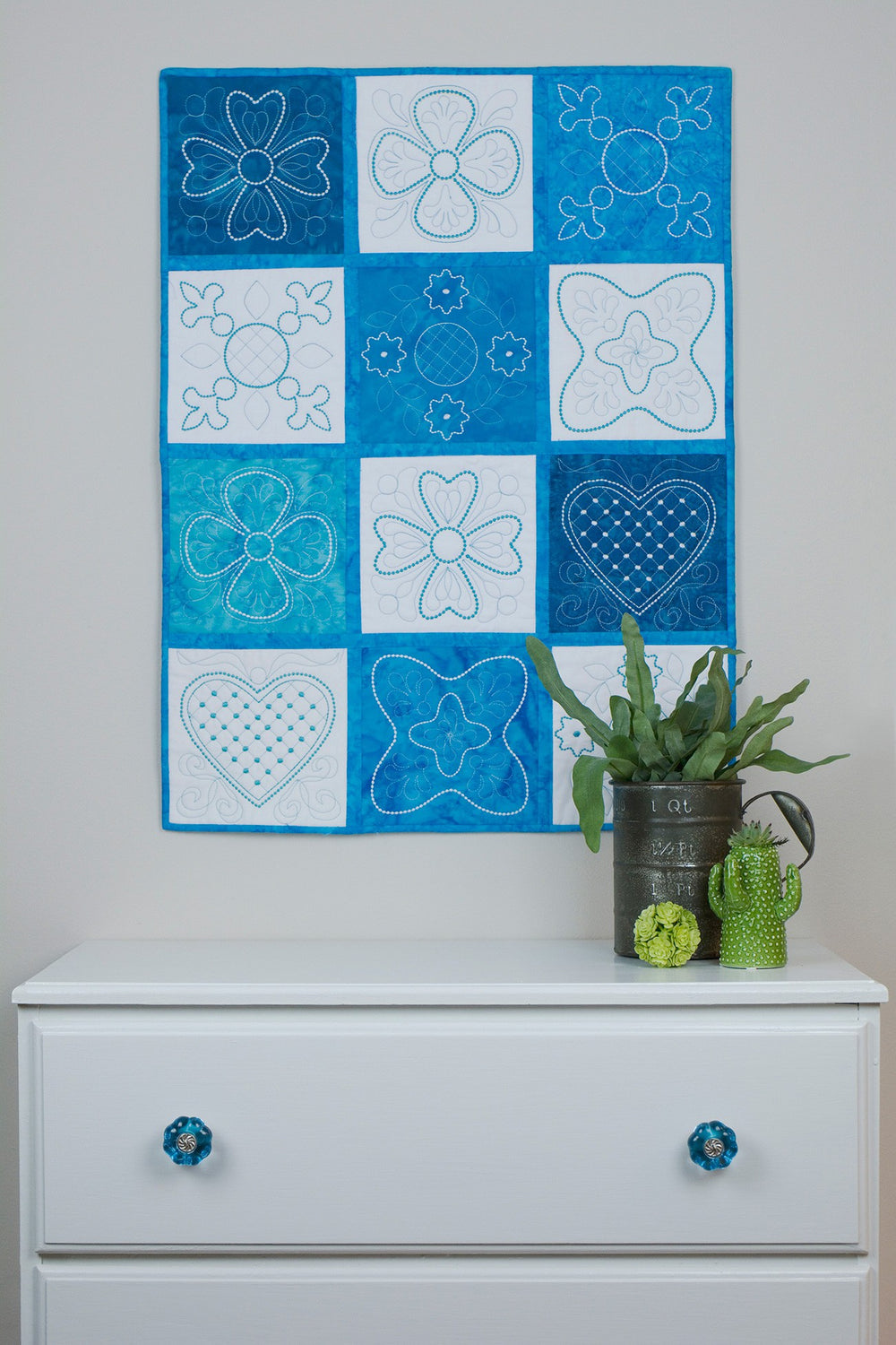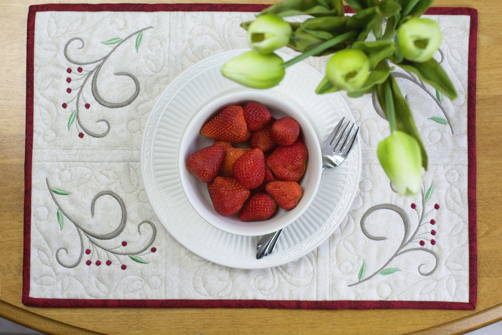 10 projects, including 3 quilts, place mats, a table runner, 2 wall hangings, a pillow, and 2 tote bags.