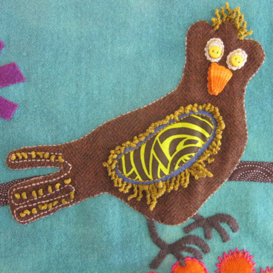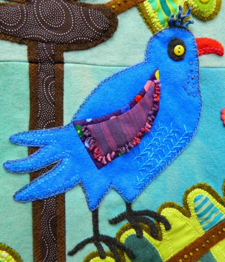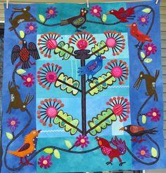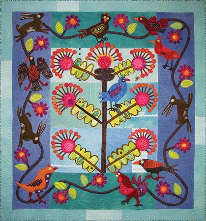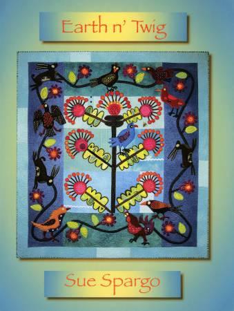 47" x 50". The inspiration for this highly embellished quilt came from Sue's May 2010 visit to the beautiful city of Barcelona in Catalonia, Spain. Barcelona is filled with artistic wonders from the new cathedral by Antoni Gaudi, where every surface is coverd with wondrous works of art, to the Picasso Museum and many, many others. Sue's visit was during Spring, and the flowers were blooming in profusion. Their joyousness and color were the inspiration for the center panel of Earth n' Twig. At the pottery museum there were tiles, plates and bowls embellished with an array of birds and animals. The pieces were in many cases several hundred years old. Those images became the inspiration for the birds and bunnies in the border of the quilt.