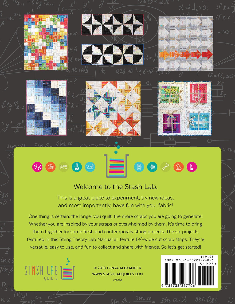 The first issue of the Lab Manual Series, String Theory features 6 modern scrappy string quilt projects that feature 1-1/2in wide cut fabric strips that can be made to fit anyone's stash style and favorite fabrics. Perfect for quilt shop scrap clubs, group projects, and scrap lovers everywhere.