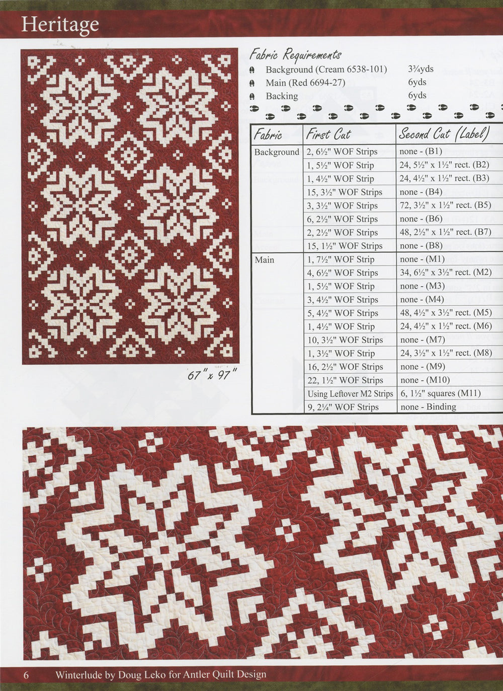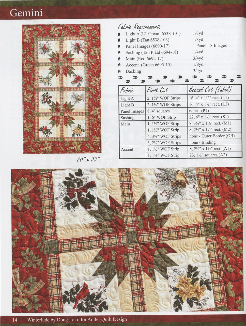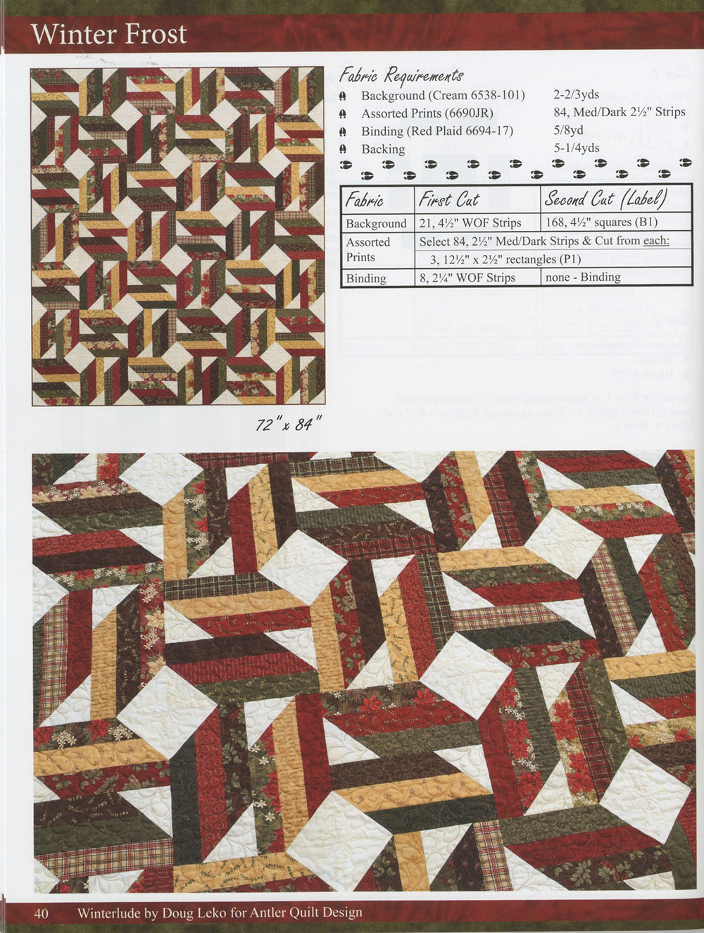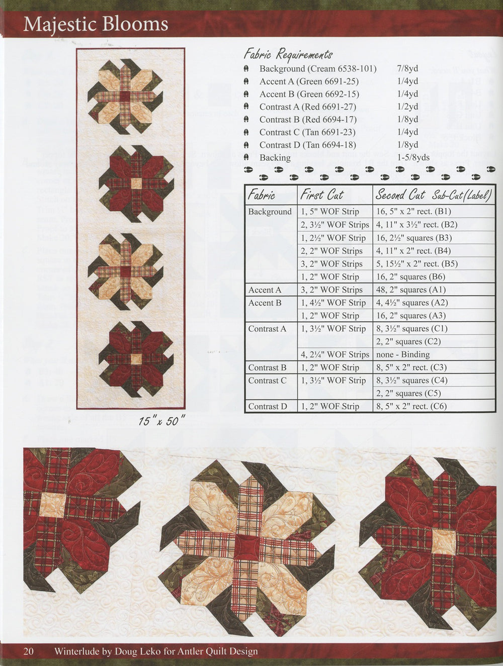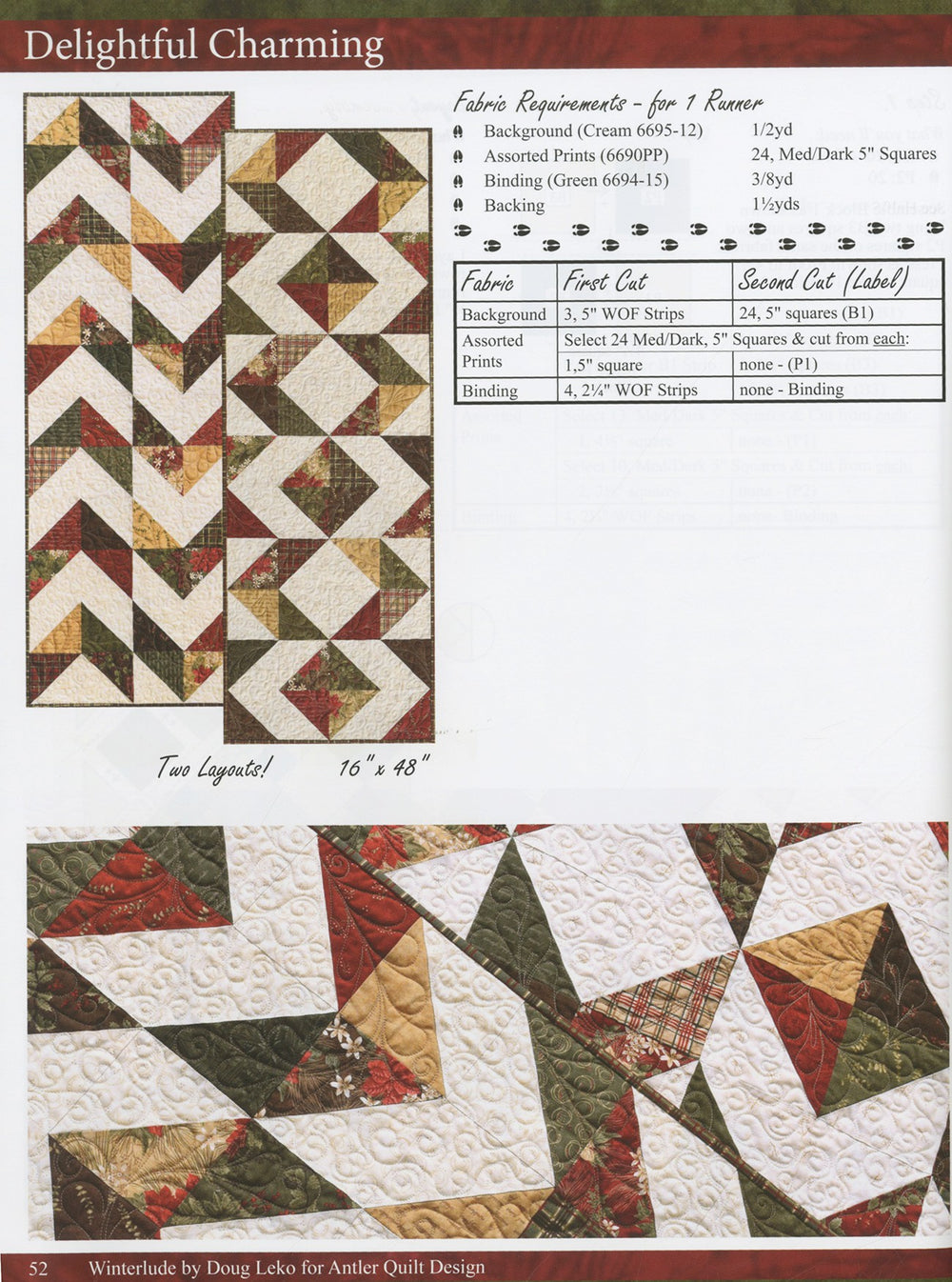 Winterlude has 18 NEW and exciting projects including; pieced quilts, wall-hangings and 10 table runners. All of the projects are shown below. Click on the image to download the page in a larger version if you would like. In addition to the Forever Green fabric line, six other Moda Fabrics lines will be featured in the book.