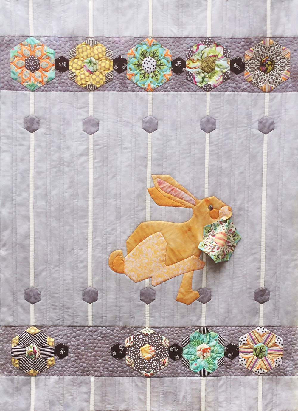 This modern remake of our popular classic incorporates colorful hexi blocks which can be sewn by hand or machine! (Complete instructions for both are included.) Our “bad hare” makes off with a block which is sewn in his mouth and lays on top of the quilt for a clever 3D effect. Hexi blocks utilize small pieces of modern prints and stripes and are set against coordinating grays. The white background strips draw the elements together and create a contemporary setting for this unusual design. (A Java House favorite!)