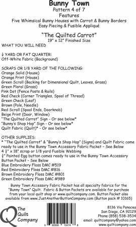 Cottontails Candy Shop, Bunny's Hare Salon and The Quilted Carrot will keep you smiling while you sew up these blocks. The pieced Carrot Border is a snap to sew and the Bunny border is easy fusible applique. Finished Quilt is 68� x 54 1/2".