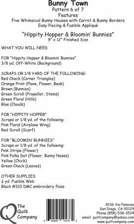 Don't you love the whimsy of a bunny flying in a Carrot Airplane? Is she flying to "The Quilted Carrot" for a fabric sale....or over to "Bunny's Hare Salon" for a new "do"? "Hippity Hopper" is easy fusible applique and machine blanket stitching.