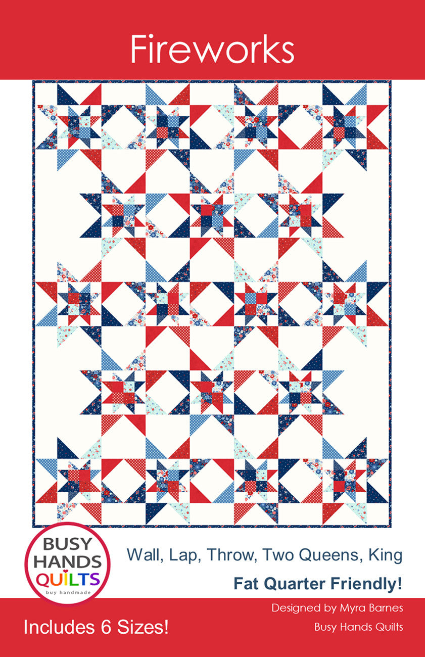 You'll love that Fireworks includes 6 sizes - Wall, Lap, Throw, Square Queen, Rectangular Queen, and King - so you can make the size you really want without doing any extra math! Cover quilt is Star Spangled Beauty by Maywood Studio.