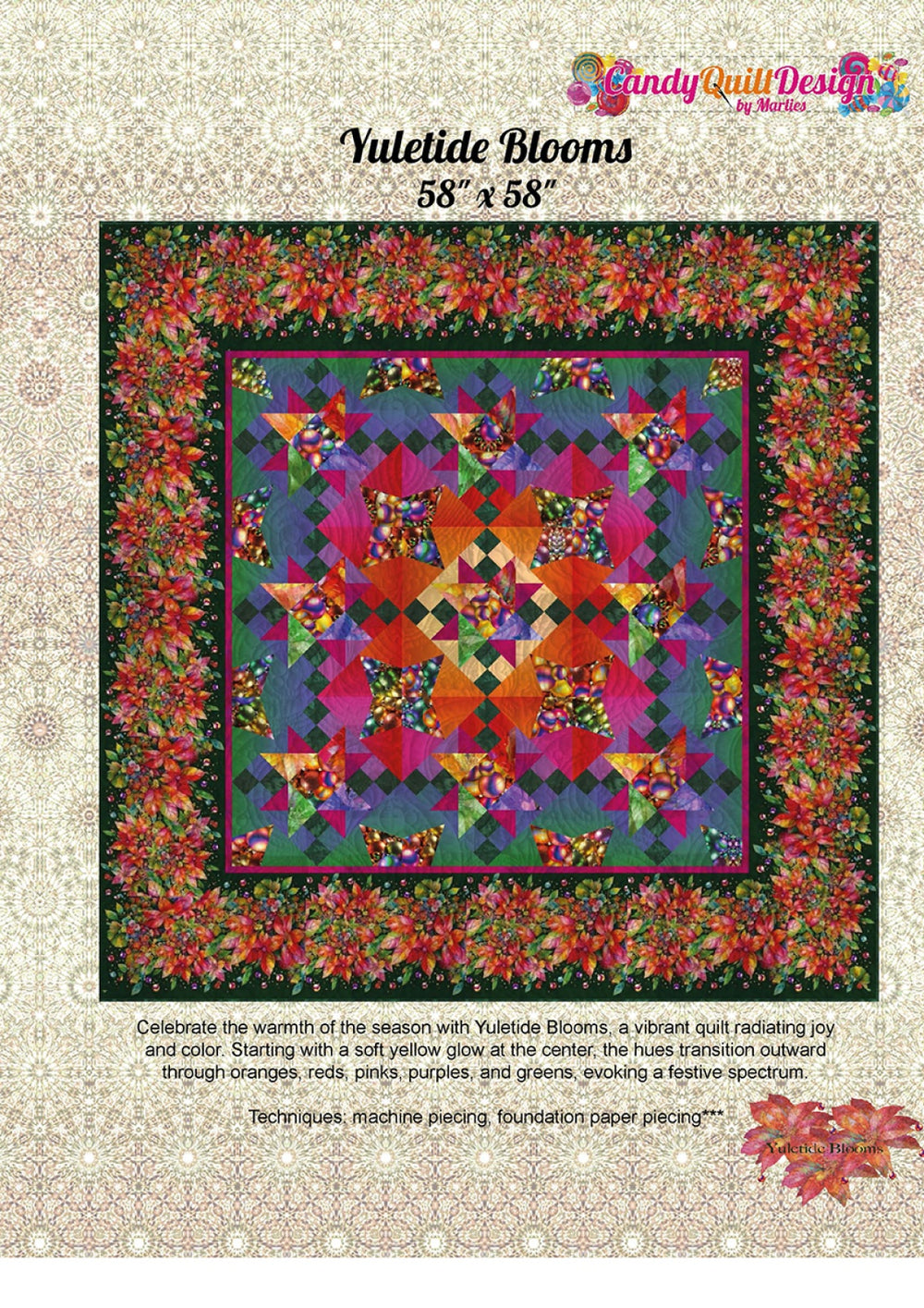 Celebrate the warmth of the season with Yuletide Blooms, a vibrant quilt radiating joy and color. Starting with a soft yellow glow at the center, the hues transition outward through oranges, reds, pinks, purples, and greens, evoking a festive spectrum