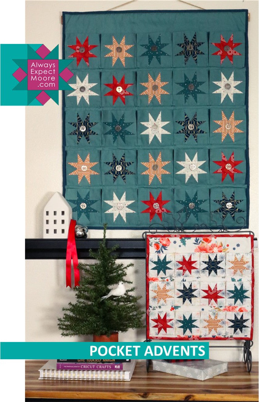 Two patterns in one! The Pocket Advents offers both a 25-pocket wall hanging (22.5in x 28in) and 12-pocket mini (12in x 12in) option! Make one or both for a DIY Advent calendar. Both designs require the Creative Grids Strippy Star tool to make the star fronts on the pockets. The 12-pocket mini is designed to hang on a wire frame for display. Incredibly popular at Christmas, or Christmas in July.