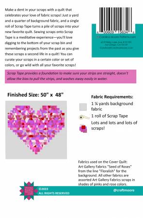 Make a dent in your scraps with a quilt that celebrates your love of fabric scraps! Just a yard and a quarter of background fabric, and a single roll of Scrap Tape turns a pile of scraps into your new favorite quilt. Sewing scraps onto Scrap Tape is a meditative experience—you'll love digging to the bottom of your scrap bin and remembering projects from the past as you give these scraps a second life in a quilt! You can curate your scraps in a certain color or set of colors, or go wild with all your favorite scraps!