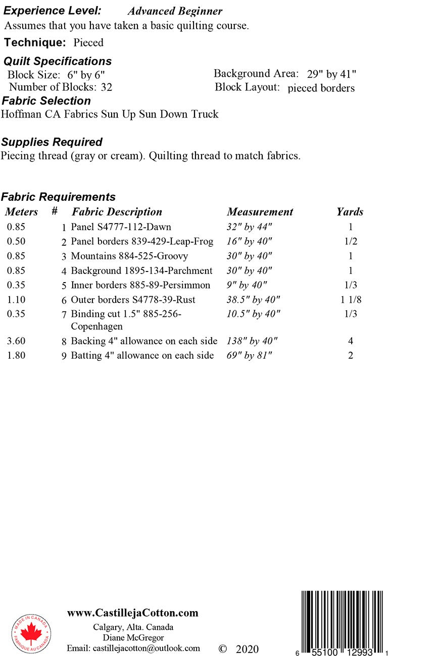 Barn and truck fabric panel with a pieced mountain block border. Lap/Throw quilt pattern.