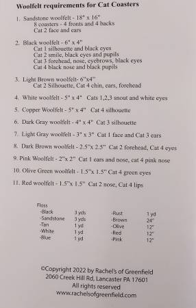 Attention all Cat lovers. The cat coasters pattern includes the pattern and templates as well as all woolfelt and floss measurements and requirements to make the coasters. Each coaster is approximately 5” in diameter. Colors are Sandstone, black, copper, charcoal, tan, pink and white. These adorable coasters will add charm to your collection. They can also be used as ornaments. Pattern only.