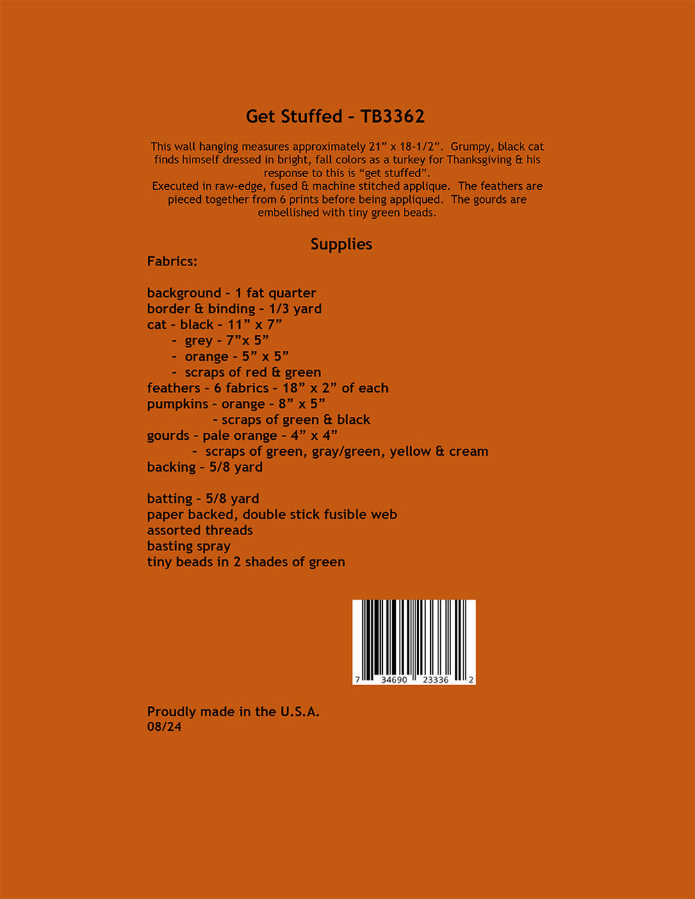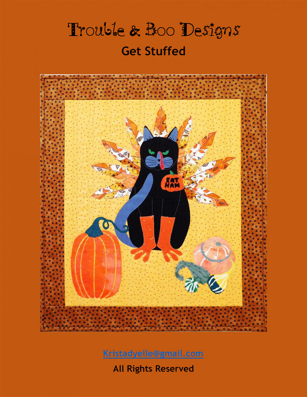 This wall hanging measures approximately 21” x 18-1/2”. Grumpy, black cat finds himself dressed in bright, fall colors as a turkey for Thanksgiving & his response to this is “get stuffed”. Executed in raw-edge, fused & machine stitched applique. The feathers are pieced together from 6 prints before being appliqued. The gourds are embellished with tiny green beads.