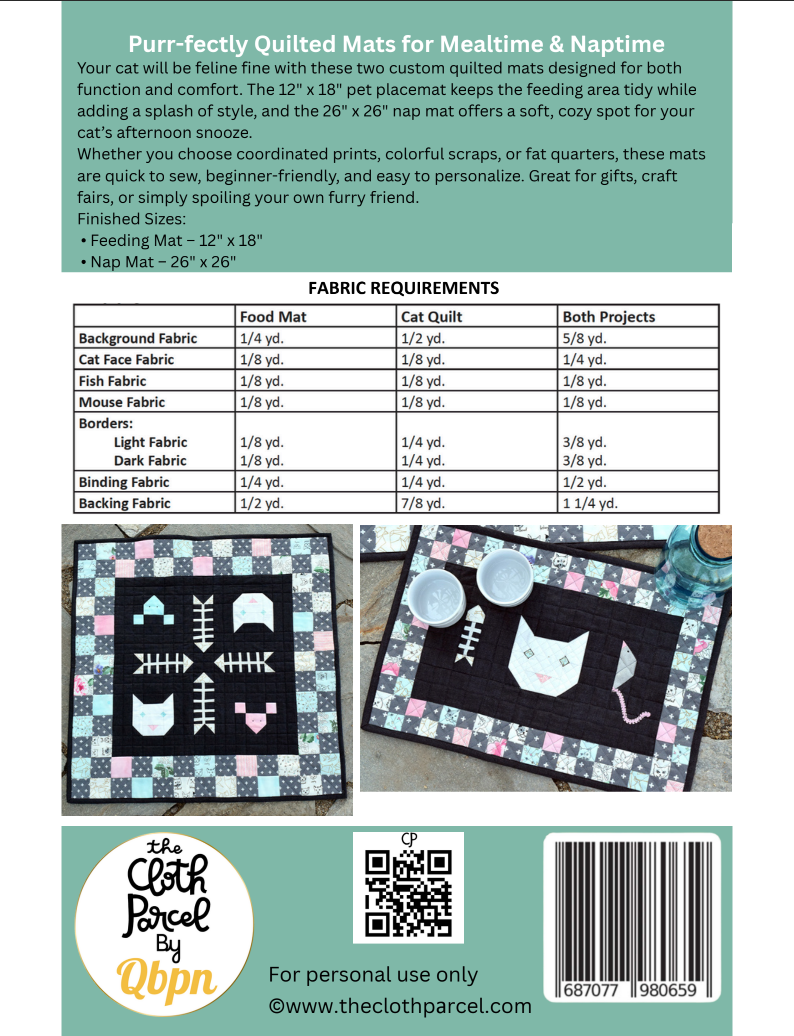 Treat your favorite feline friends to a set of quilts, all their own!  The smaller food mat is perfect for kitty’s feeding time, and the quilt is specially sized for a quick cat nap.