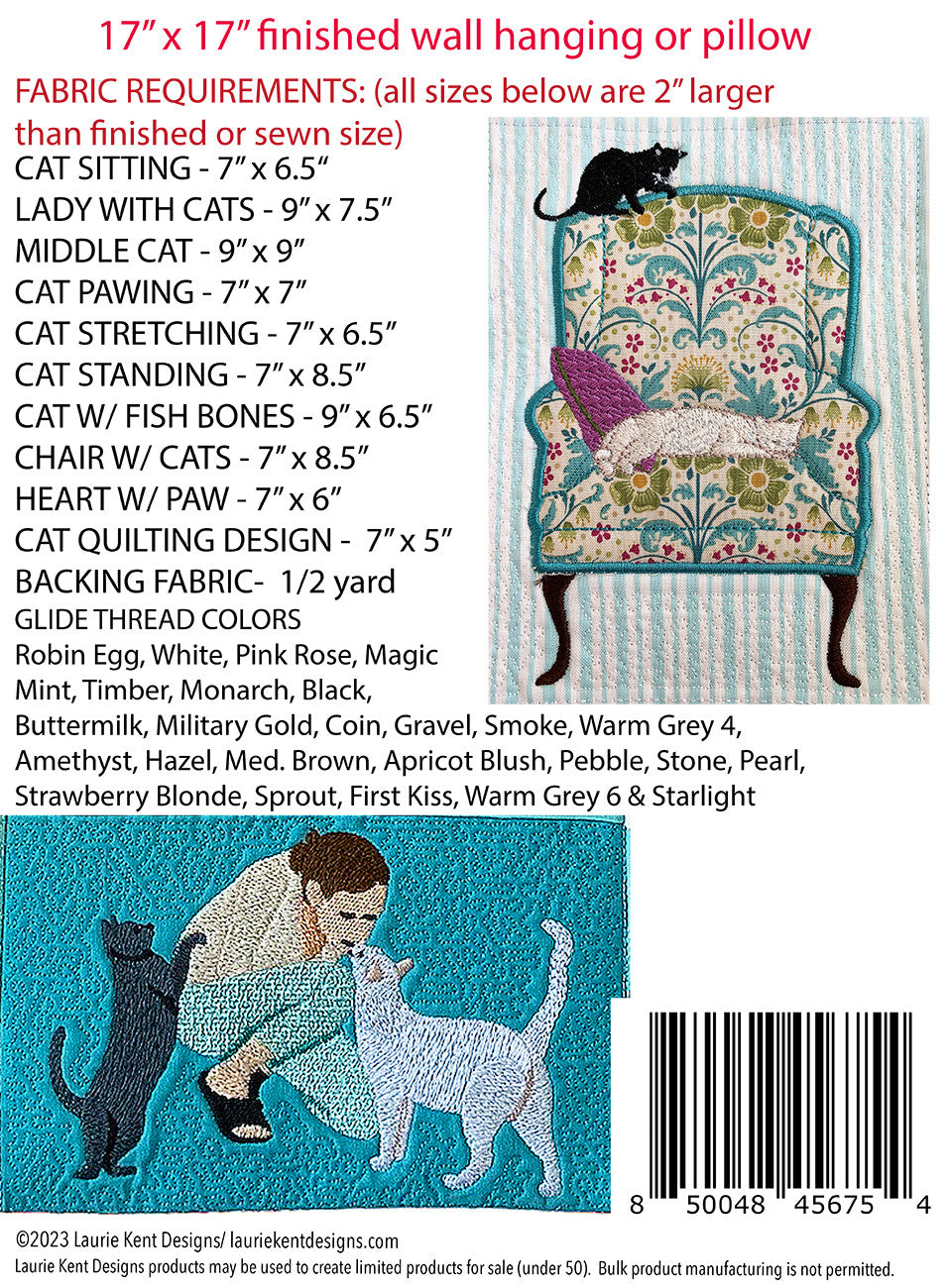Finishes at 17"X 17" and is made into a pillow or wall hanging or you can use the individual blocks for any special project. Featuring cats lounging on a chair, walking, stretching, pawing, standing, and sitting.