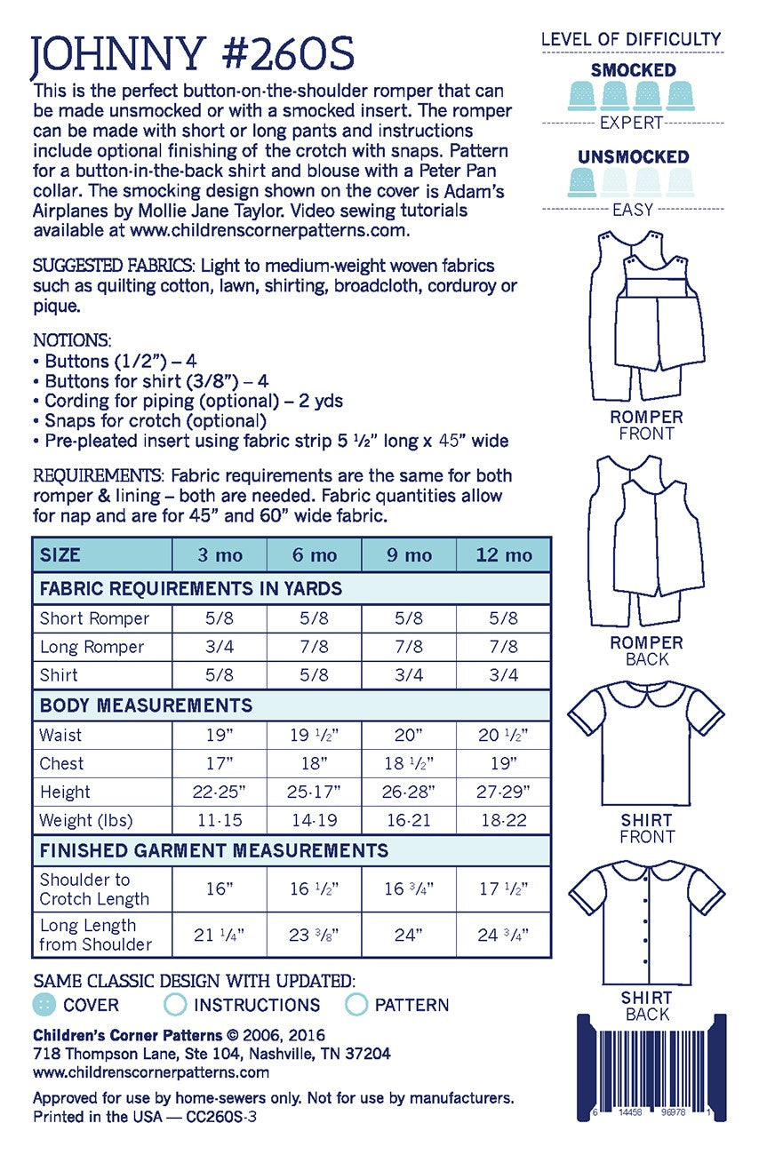Johnny is the perfect button-on-the-shoulder romper. Simple in design, it has both center front and back seams and side seams for a better fit. The romper can be short or long, and the crotch can be finished with snaps. Video is available online for help with leg bottoms. Johnny can be made smocked or unsmocked. The smocking design shown on the sample is Primarily Colors by Little Memories. Pattern for a shirt and a blouse is included, as is an optional patch pocket on the front with pattern for a dog applique.