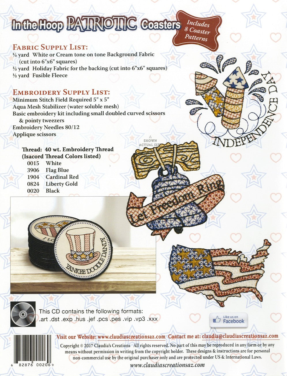 In the Hoop Patriotic themed coasters great for holidays, parties and gifts formatted in .art .dst .exp .hus .jef .pc s .pes .vip ..vp3 .xxx