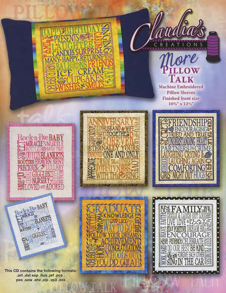 Kit includes a CD-ROM containing the design files in multiple formats, tutorials, and templates. The packaging includes the fabric, embroidery supply, and sewing supply lists. Embroidery formats include: art, dst, exp, hus, jef, pcs, pes, sew, shv, vip, vp3, & xxx.