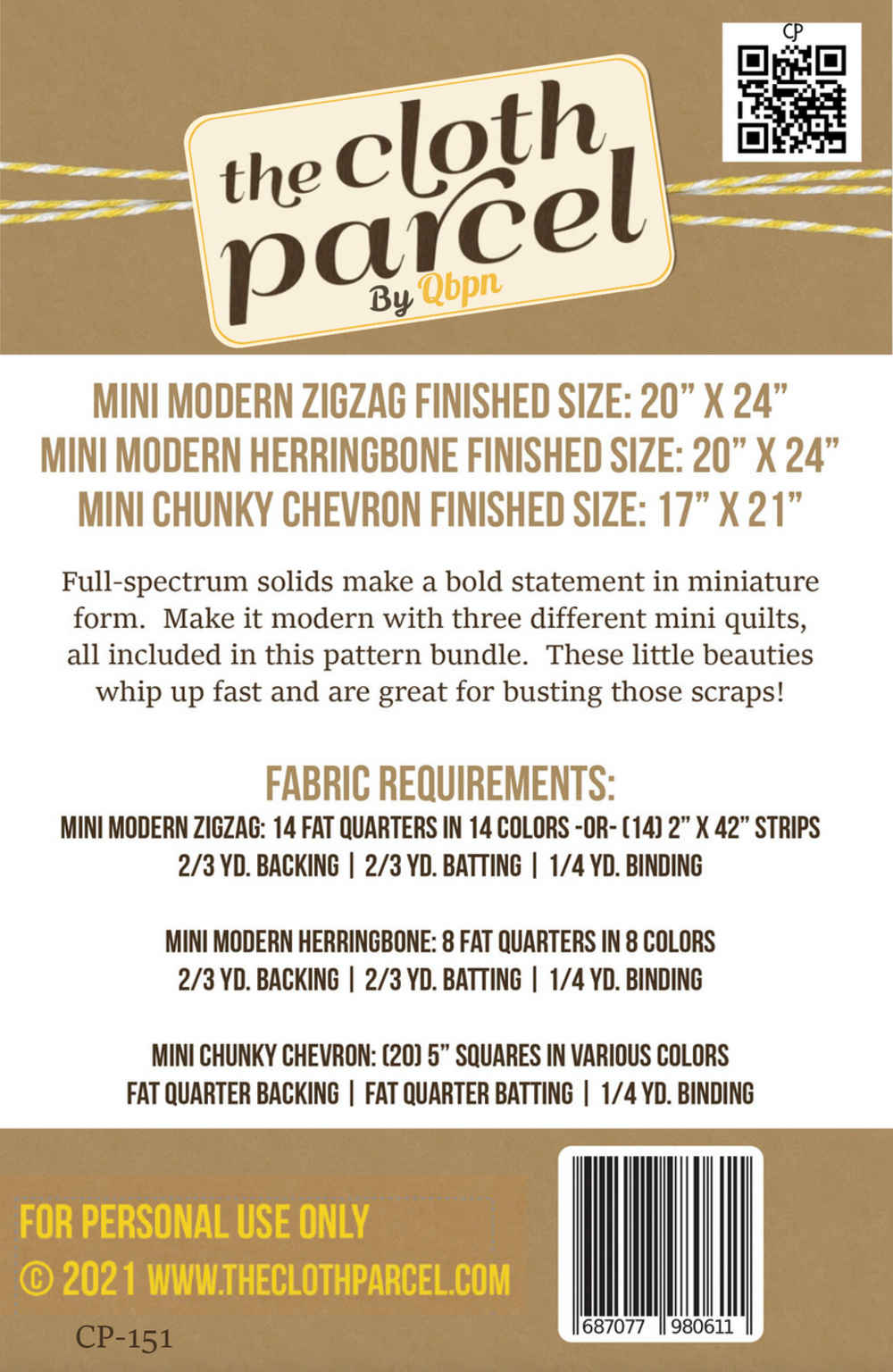 The pattern includes full instructions for three modern mini quilts: Zigzag, Herringbone, and Chunky Chevron.