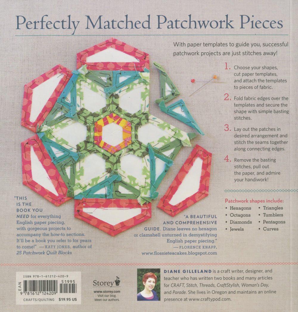 The key to perfect patchwork is getting all of the points to match up -- which is no easy feat! Thanks to the rediscovery of a traditional technique known as English paper piecing, success is now possible for quilters of all levels. By cutting the desired shapes from paper, basting the paper to the back of your fabric, and then hand-sewing the pieces together, youll ensure perfectly matched points every time. This complete course in English paper piecing takes you far beyond traditional hexagons with step-by-step photos showing you how to connect triangles, octagons, diamonds, jewels, triangles, tumblers, pentagons, and curved shapes. It even provides dozens of ideas for incorporating the pattern designs into clothing, pillows, quilts, and home decor items!
