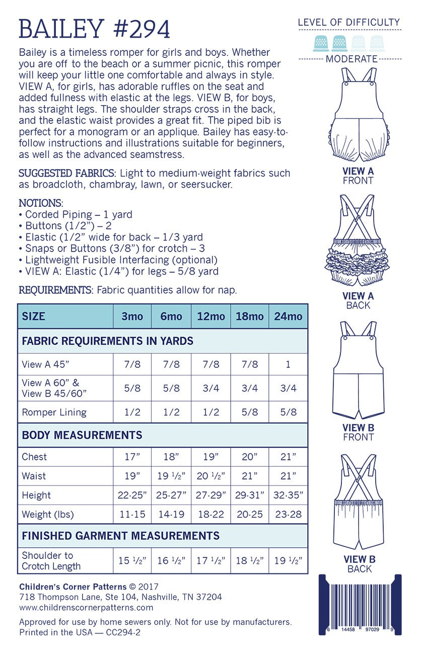 Bailey is a timeless romper for girls and boys. Whether you are off to the beach or a summer picnic, this romper will keep your little one comfortable and always in style. View A, for girls, has adorable ruffles on the seat and added fullness with elastic at the legs. View B, for boys, has straight legs. The shoulder straps cross in the back and the elastic waist provides a great fit. The piped bib is perfect for a monogram or an applique. Bailey has easy-to-follow instructions and illustrations suitable for beginners as well as the advanced seamstress.