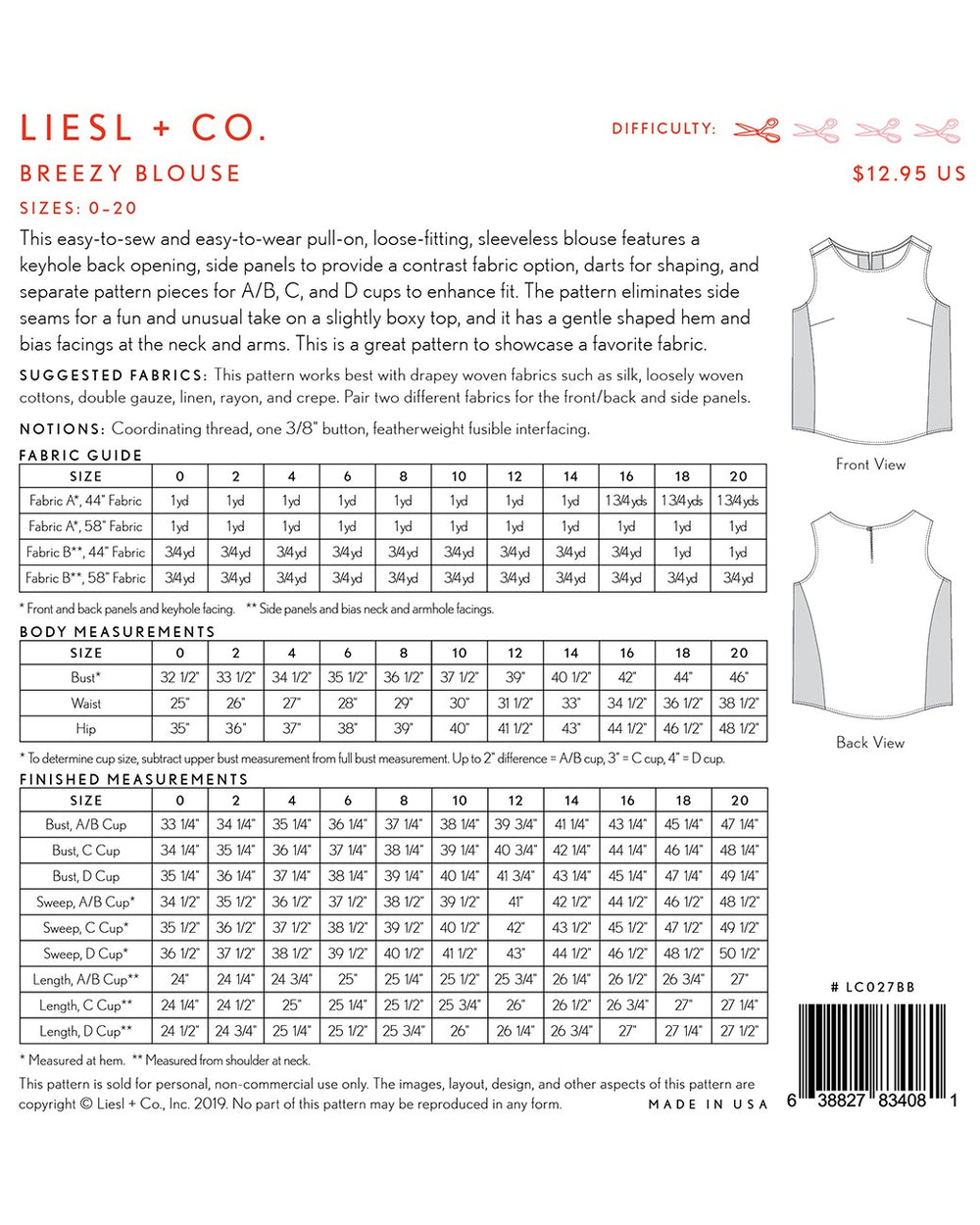 This easy-to-sew and easy-to-wear pull-on, loose-fitting, sleeveless blouse features a keyhole back opening, side panels to provide a contrast fabric option, darts for shaping, and separate pattern pieces for A/B, C, and D cups to enhance fit. The pattern eliminates side seams for a fun and unusual take on a slightly boxy top, and it has a gentle shaped hem and bias facings at the neck and arms. This is a great pattern to showcase a favorite fabric. Women's sizes 0-20.