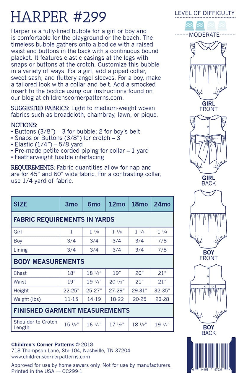 Harper is a fully-lined bubble for a girl or boy and is comfortable for the playground or the beach. The timeless bubble gathers onto a bodice with a raised waist and buttons in the back with a continuous bound placket. It features elastic casings at the legs with snaps or buttons at the crotch. Customize this bubble in a variety of ways. For a girl, add a piped collar, sweet sash, and fluttery angel sleeves. For a boy, make a tailored look with a collar and belt.