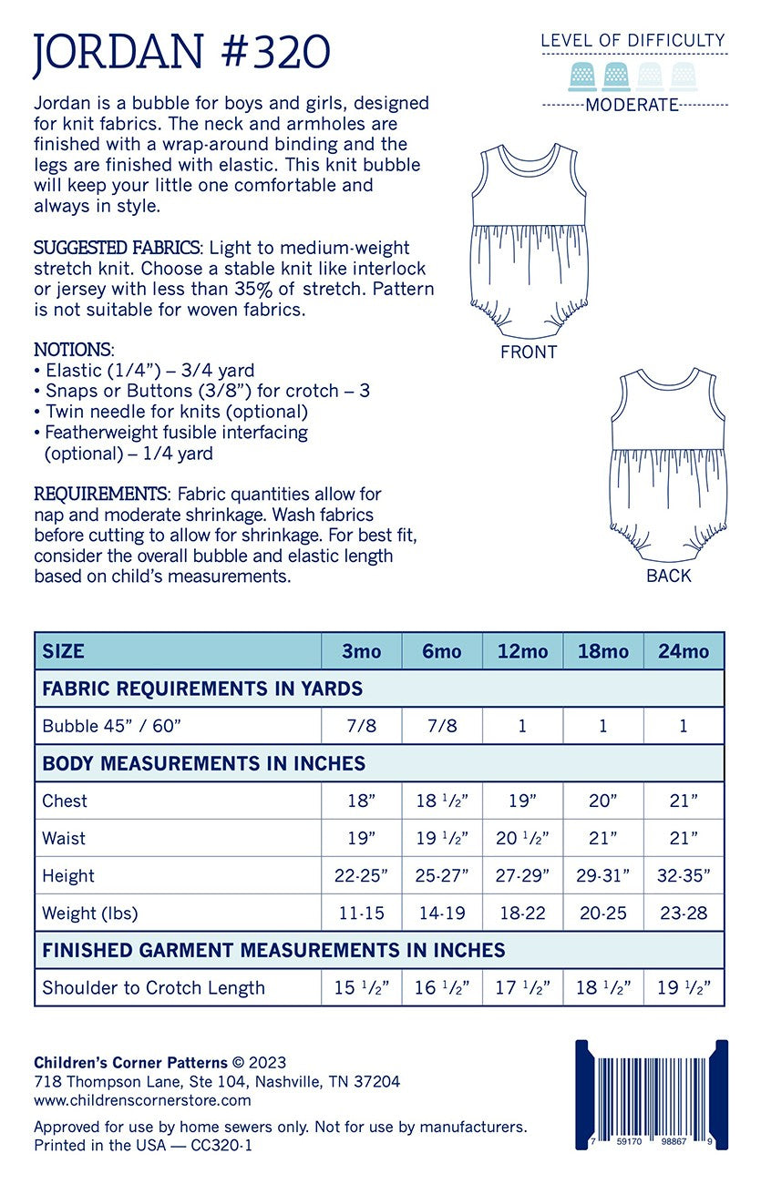 Jordan is a bubble for boys and girls, designed for knit fabrics. The neck and armholes are finished with a wrap-around binding and the legs are finished with elastic. This knit bubble will keep your little one comfortable and always in style. Available in sizes 3mo-24mo.