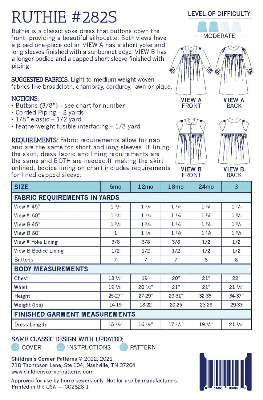 Ruthie is a classic Children's Corner yoke dress that buttons down the front, providing a beautiful silhouette. Both views have a piped one-piece collar. View A has a short yoke and long sleeves finished with a sunbonnet edge. View B has a longer yoke and a capped short sleeve finished with piping. Includes Sizes 6 months - 3.