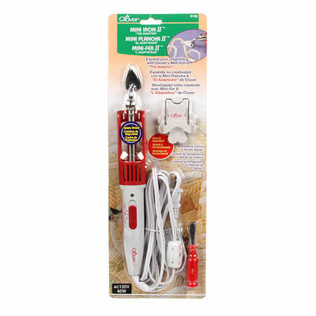Clover Mini Iron II features interchangeable tips that can be used for quilting, sewing and crafting, doll making and stenciling. The Clover Mini Iron II also features new and improved slide-stitch heat controls and easy to grip handle design. Package includes Mini Iron II, small adapter iron tip, screwdriver for changing tips and iron stand.