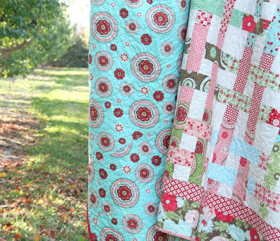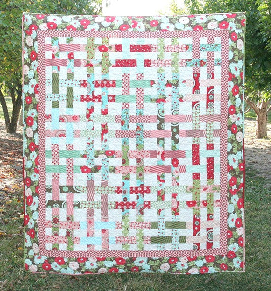 Basket Case is my favorite pattern yet with strips that seam to weave in and out of each other. It is all machine pieced from just one jelly roll, cream fabric, and border fabrics. The simple cutting and piecing instructions minimize lots of pesky visible seams and will have your friends wondering how you did it.