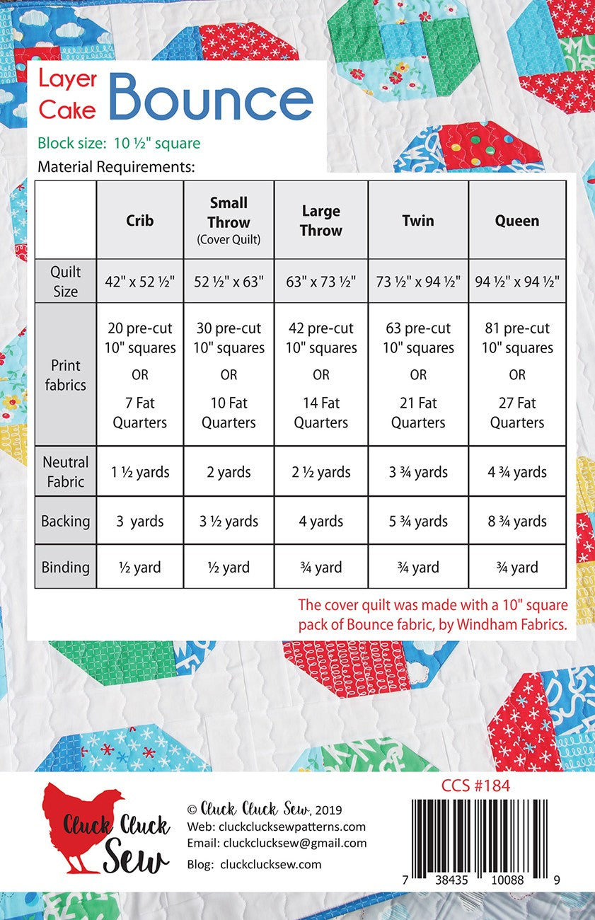Layer Cake Bounce includes 5 sizes, Crib, Small Throw, Large Throw, Twin, and Queen. The pattern uses conventional piecing techniques and can be made using 10" pre-cut squares, or fat quarters.