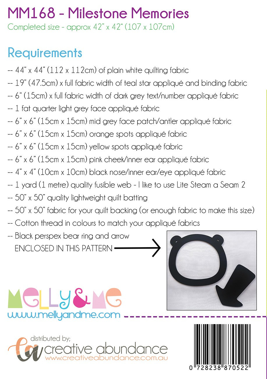 This small quilt can be used to capture the precious milestones of your, or your loved ones’ new bundle of joy. Use the quilt as a photo backdrop to memorialise those ever-changing growth and development stages with flair. After 12 months the quilt becomes a precious memento that will be enjoyed for many years to come! The PERFECT gift for any expectant parent. Pattern includes 1 set of Perspex Arrow and Bear ring Designed by Melanie McNeice of Melly & Me