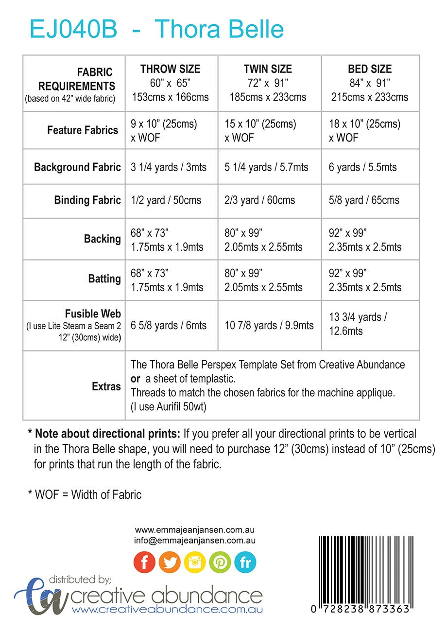 A stylish quilt design that would look fabulous on a bed or draped over a lounge. Perfect for showcasing those large prints that you just can’t bare to cut into. The pattern includes detailed instructions with clear diagrams and also comes with a colouring sheet. A perspex template is also available to help with the making of this quilt. The pattern comes with requirements and instructions for three sizes. Throw Finished Quilt Size: 153cms x 166cms (60” x 65”). Twin Finished Quilt Size: 185cms x 233cms (72” x 91”). Queen Finished Quilt Size: 215cms x 233cms (84” x 91”). Designed by Emma Jean Jansen using Hindsight Fabrics