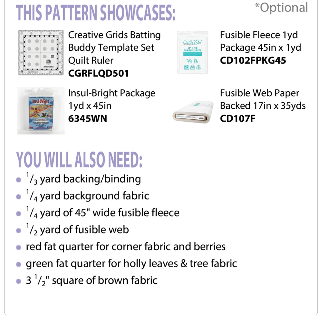 Easy and done are words to describe these adorable pot holders. The Creative Grids Batting Buddy (CGRFLQD501) is your template for the front and the back. Applique and quilt all at once!