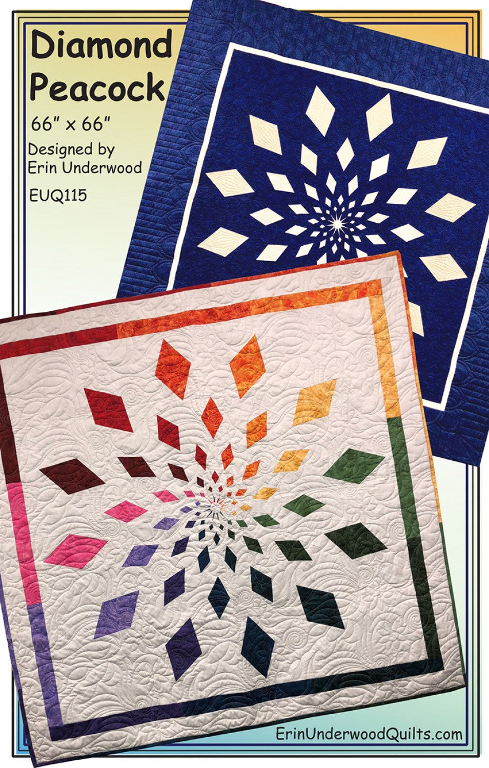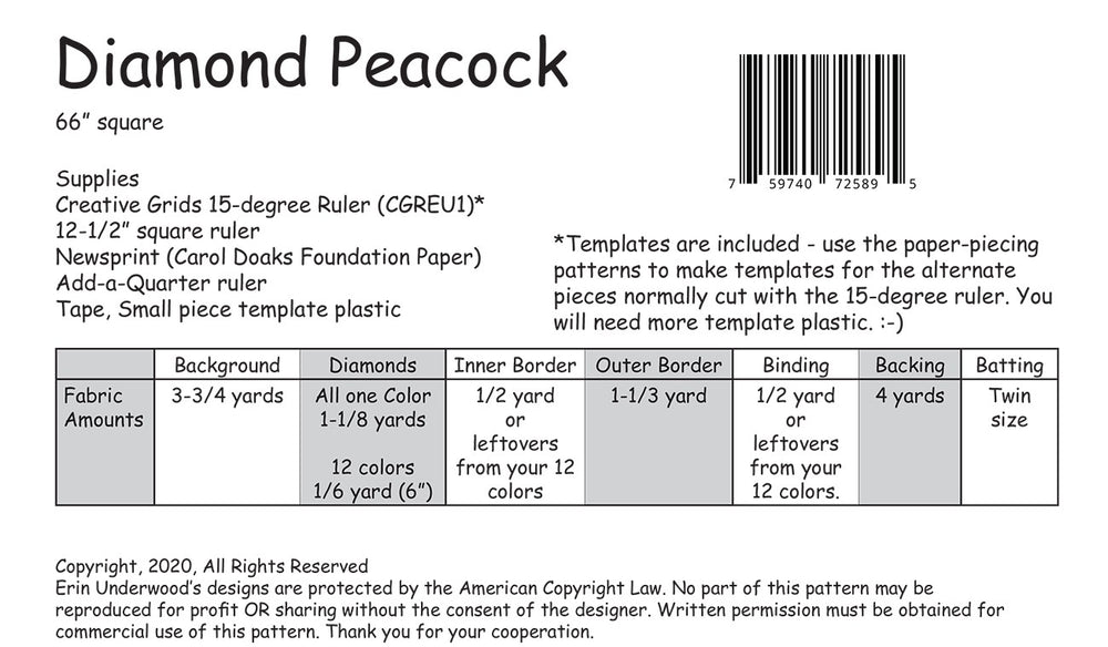 66in x 66in This vibrant quilt uses the Creative Grids 15-degree Triangle Ruler (CGREU1) in combination with paper piecing to create the stunning diamond spray of a peacocks tail.