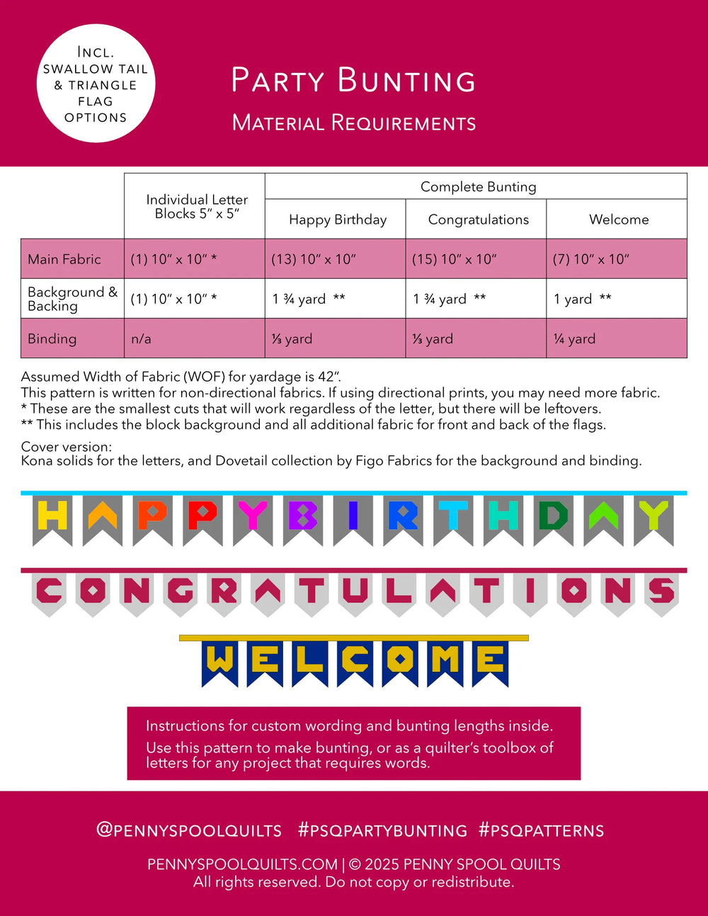 Party Bunting is suitable for scraps, but includes yardage for the three bunting options covered.