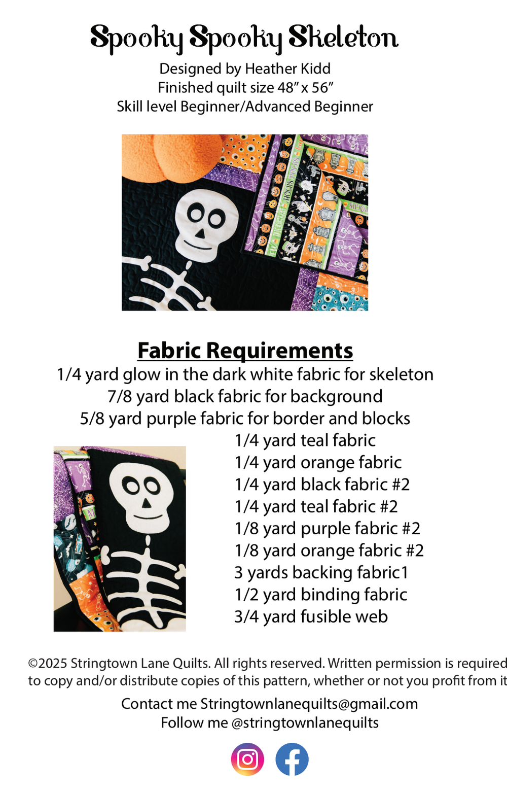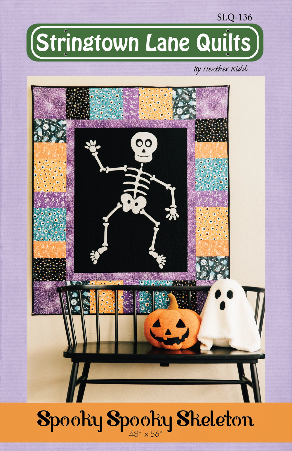 This quilt pattern features an adorable skeleton with glow-in-the-dark applique bones. Wall hanging or small throw quilt finishes 48" x 56".