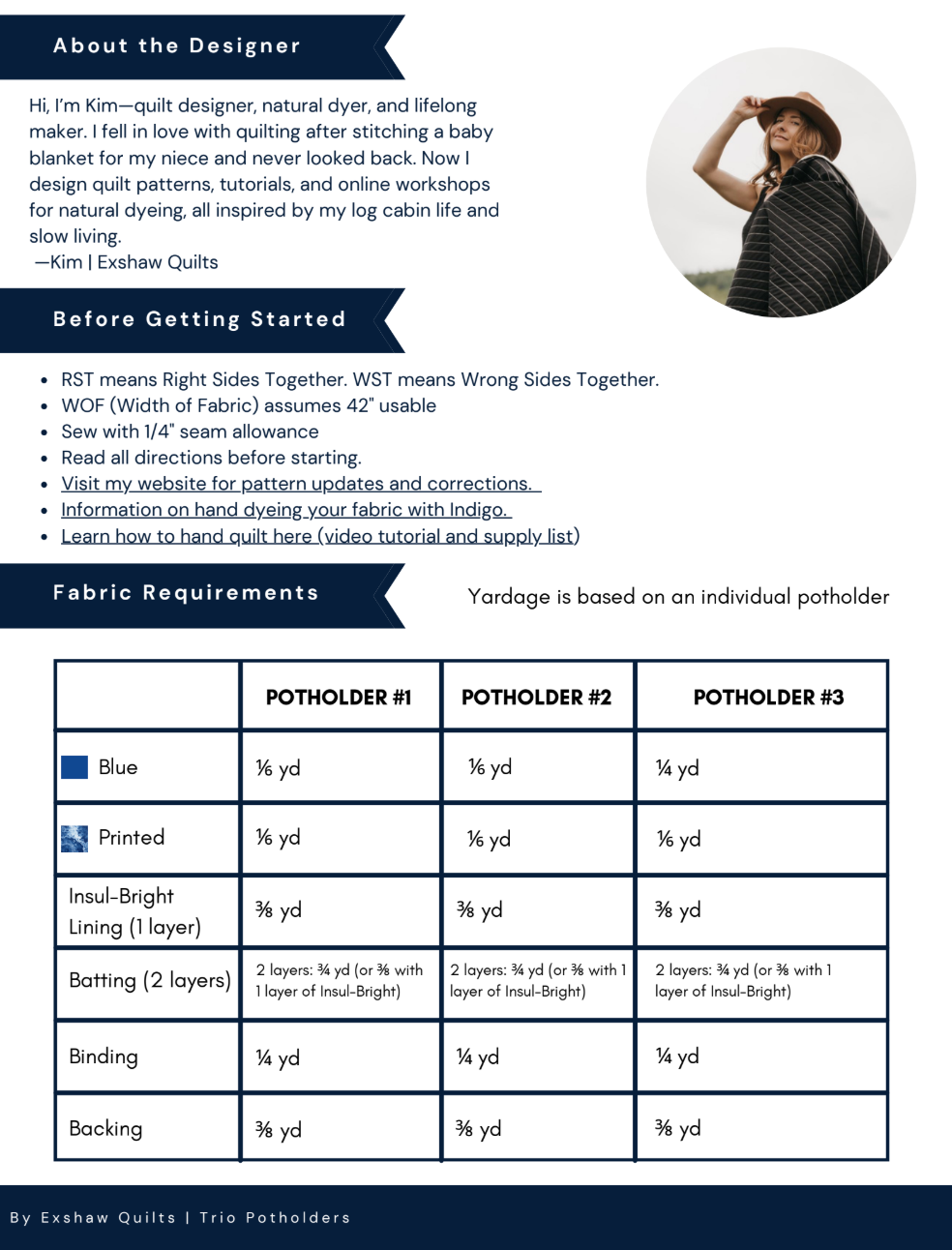 • All patterns assume 42″ WOF and ¼″ seam allowance