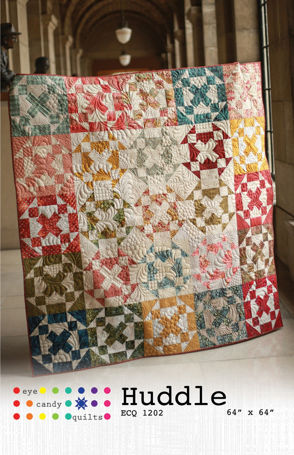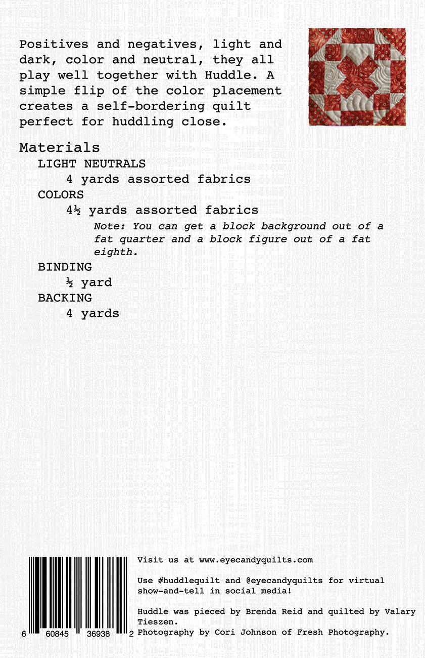Huddle is 64in x 64in. Positives and negatives, light and dark, color and neutral, they all play well together with Huddle. A simple flip of the color placement creates a self-bordering quilt perfect for huddling close. The pattern is four pages.
