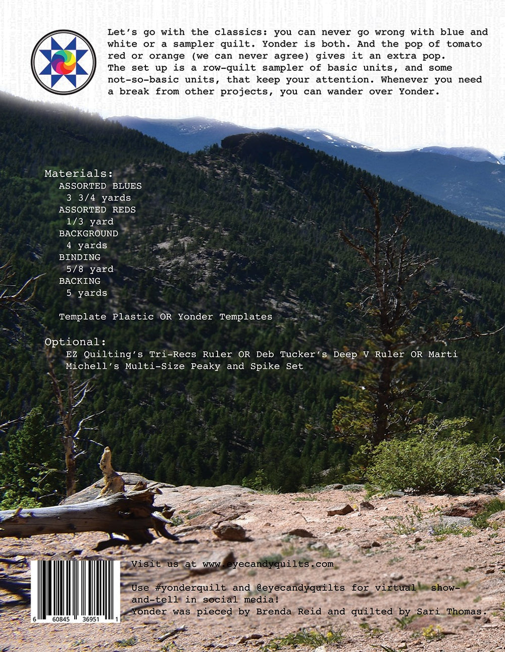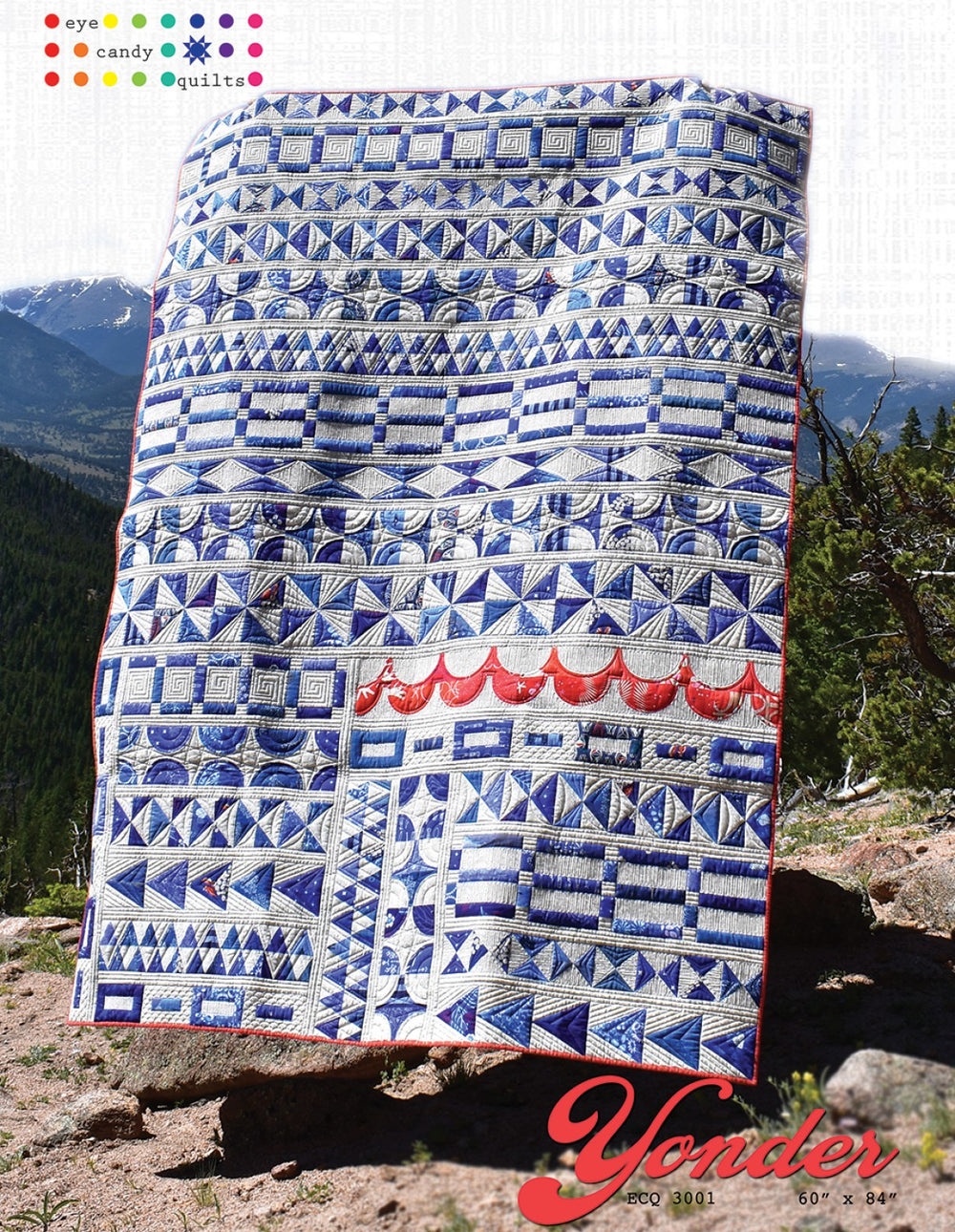 Yonder is 60in x 84in. Let's go with the classics: you can never go wrong with blue and white or a sampler quilt. Yonder is both. And the pop of tomato red or orange (we can never agree) gives it an extra pop. The block of the month friendly set up is a row-quilt sampler of basic units, and some not-so-basic units, that keep your attention. The Tri-Recs Rulers, Marti Michell's Peaky and Spike Rulers are extremely helpful, but not required, in cutting out your template pieces. The pattern is 29 pages plus three template page and one coloring page.
