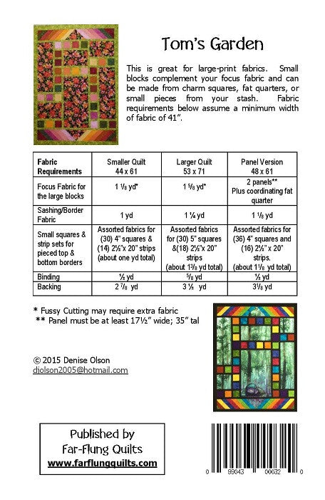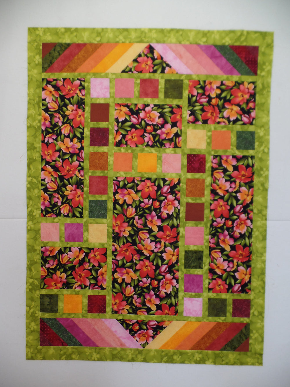 This is great for large-print fabrics. Small blocks complement your focus fabric and can be made from charm squares, fat quarters, or small pieces from your stash. Three sizes included - Smaller 44" x 61"; Larger 53" x 71"; Panel Version 48" x 61". Great for large scale print fabrics or large printed panels.