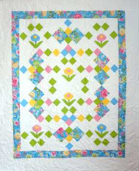 Use one print and solids to make this lovely qilt. The wall hanging size would be a great baby quilt! Or use 30's fabrics in the pieced blocks to go with the vintage flower blocks. Pattern includes sizes wall hanging (43" square), throw (49" x 60") and twin (75" x 86").