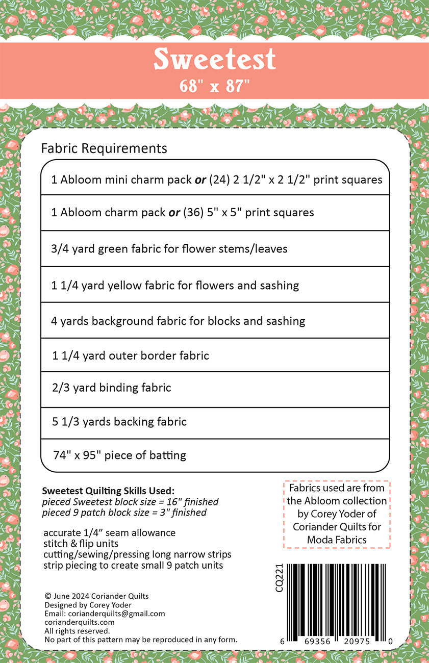 Sweetest is a full color booklet style pattern. It is a charm pack friendly quilt featuring the Abloom collection by Corey Yoder of Coriander Quilts for Moda Fabrics.