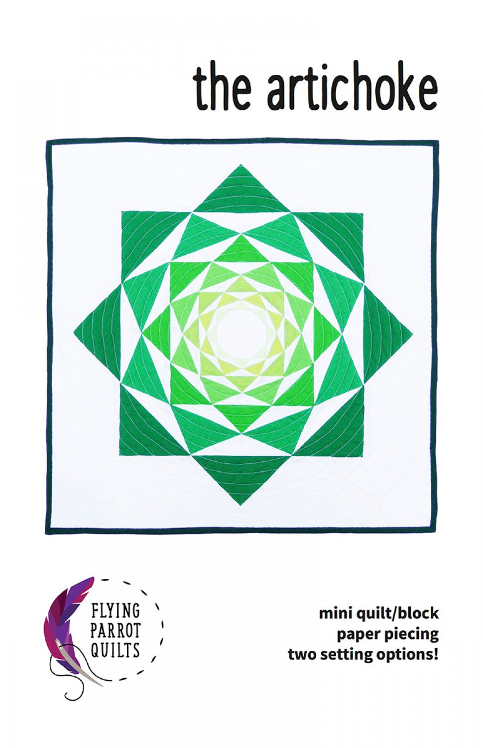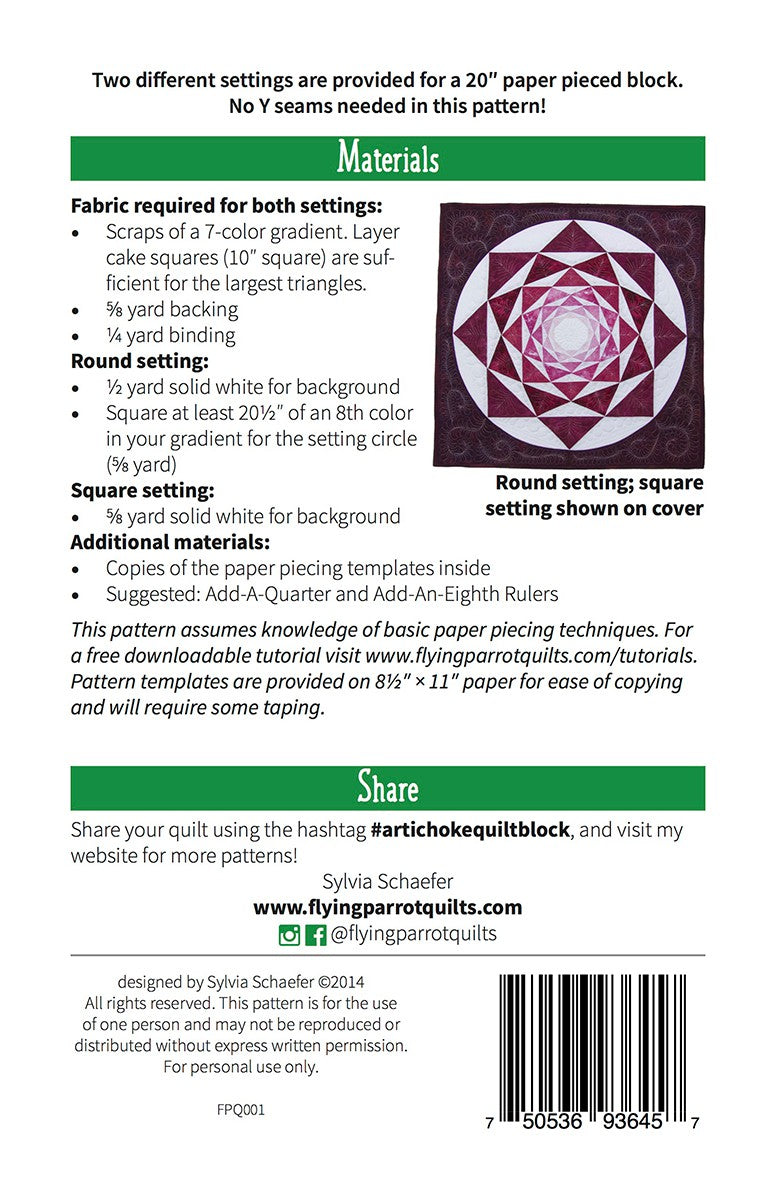 The Artichoke is a foundation paper pieced mini quilt/block pattern that finishes at 20in square. No Y-seams are needed for this showstopper! The pattern includes two setting options to choose from: a basic square setting as shown on the cover, and one featuring a setting circle around the outside of the rosette. Knowledge of basic paper piecing techniques is assumed. Full color pattern booklet and foundation templates on 8-1/2in x 11in paper for ease of copying are included.