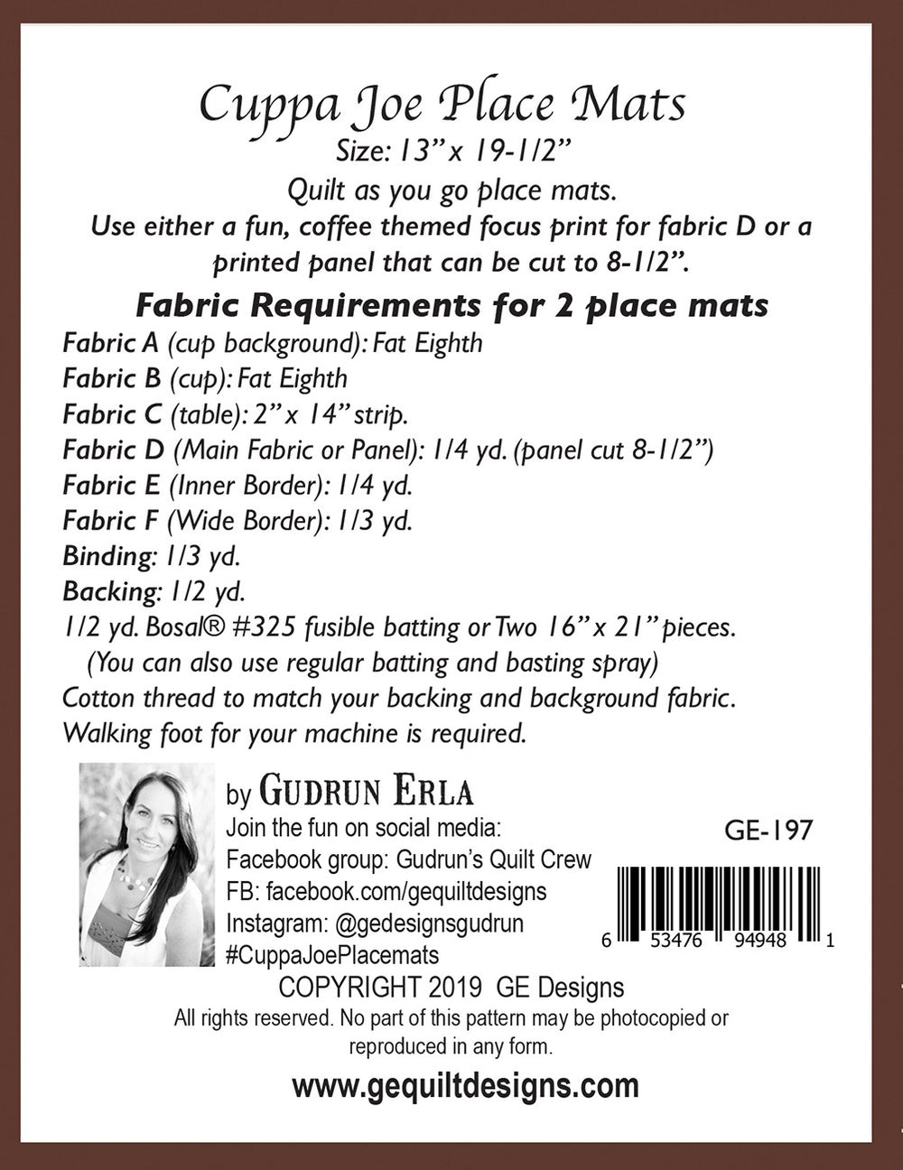 These quilt as you go placemats can use a fun, coffee themed focus print, or any printed panel that can be cut to 8-1/2in.