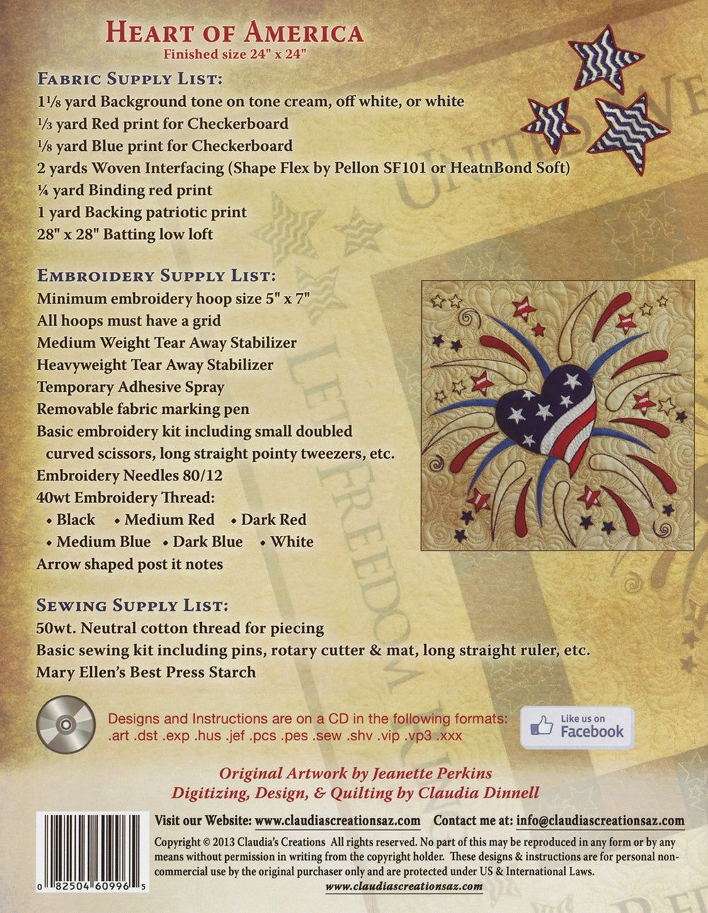 Get your patriotic juices flowing in red, white, and blue by embroidering this heartfelt wall hanging or table topper! Machine Embroidery designs for 5 X 7 hoops and larger in all formats including: art. dst. .exp .hus.Jef .pcs .pes .sew .sho .vip .vp3 and .xxx. #HA91787.