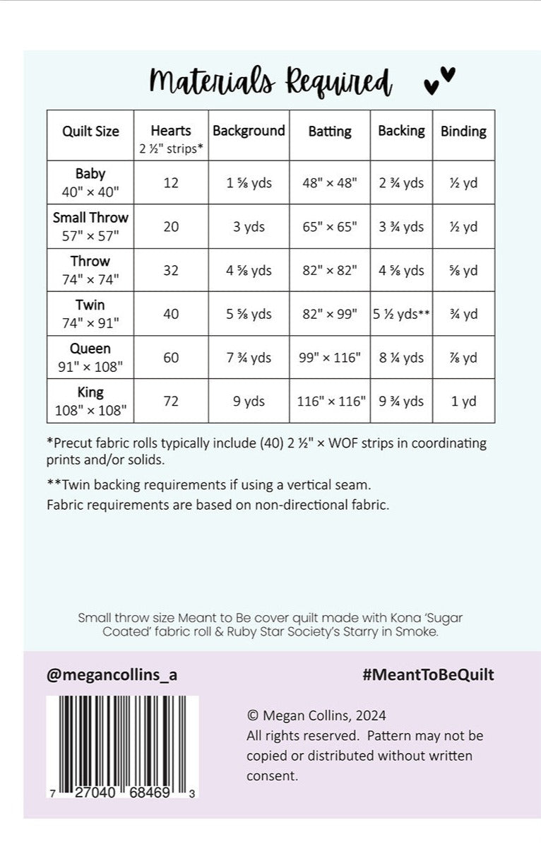 Meant to Be is a precut friendly curved piecing quilt pattern, so find your favorite fabric roll, and let’s make hearts! Precut 2 ½" strips and 12" blocks make this pattern a quick make. The pattern includes detailed step-by-step instructions and illustrations, a coloring page, and full-size pattern template pages.