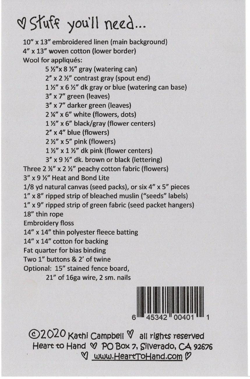 13’ x 22” wall hanging. Wool appliqué on embroidered linen background, embroidered canvas seed packs, and dangling wool flowers. We hung it on a stained fence board (instructions included), but it could be hung on an old shutter, door panel, or any architectural piece.