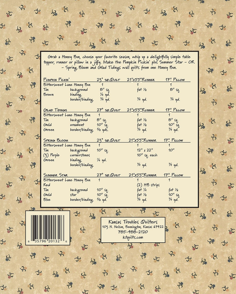 Bittersweet & Honey - A Dozen Seasonal Projects featuring Bittersweet Lane Honey Buns - Grab a Honey Bun, choose your favorite season, whip up a delightfully simple table topper, runner or pillow in a jiffy. Make the Pumpkin Pickin' plus Summer Star - OR - Spring Bloom and Glad Tidings wall quilts from one Honey Bun.